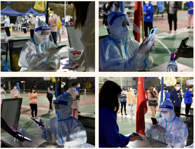 核酸采樣登記是核酸檢測工作中的重要一環(huán)。采樣登記處的“大白”根據(jù)采樣要求,以10人混檢為單位一一完成掃碼登記,仔細(xì)核對檢測人員信息。在封控的宿舍內(nèi),“大白”身披改裝挎包,一邊維持著現(xiàn)場秩序,一邊協(xié)助醫(yī)護(hù)人員掃碼登記,全力當(dāng)好醫(yī)生“好幫手”。