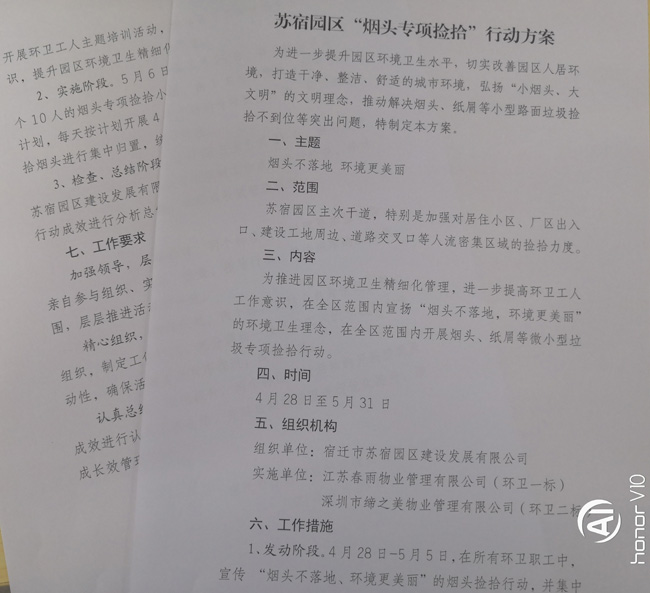 為了確?!盁燁^專項(xiàng)撿拾”行動順利開展,公司結(jié)合園區(qū)實(shí)際,精心籌劃,制定了《蘇宿園區(qū)“煙頭專項(xiàng)撿拾”行動方案》。