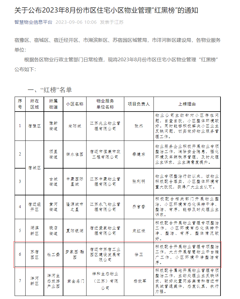 物業(yè)服務(wù)好不好,“紅黑榜”上見分曉。8月29日,宿遷市住房和城鄉(xiāng)建設(shè)局公布8月份市區(qū)住宅小區(qū)物業(yè)管理“紅黑榜”?,建發(fā)公司夢家園項目物業(yè)服務(wù)質(zhì)量綜合考評“優(yōu)秀”,榮登“紅榜”。