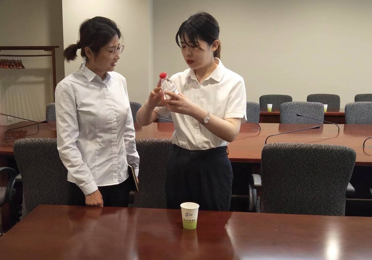 一行人兵分兩路,客服環(huán)境組跟隨蘇州工業(yè)園區(qū)環(huán)境部負責人學習會務服務的會前準備工作、會后清潔工作,重點學習會務實操服務,工程人員跟隨工程部學習會議廳設備配置和保養(yǎng)。